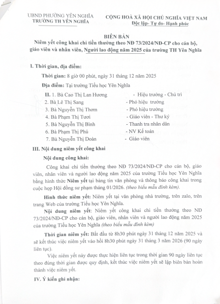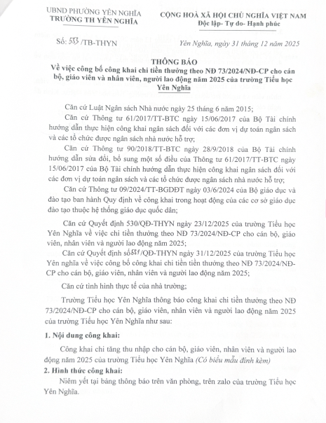 Công khai chi tiền thưởng theo NĐ 73/2024/2NĐ-CP năm 2025 cho cán bộ, giáo viên, nhân viên